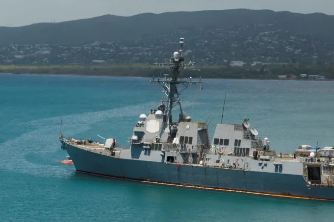 Pemandangan drone menunjukkan kapal perusak rudal yang dipandu Angkatan Laut AS USS Jason Dunham (DDG- 109 saat berlabuh di Ponce, Puerto Rico, 6 September 2025