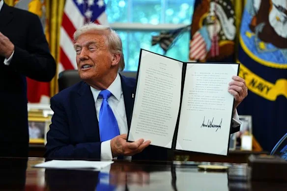 Donald Trump menampilkan perintah eksekutif yang mengesahkan biaya visa baru.Kredit: Bloomberg