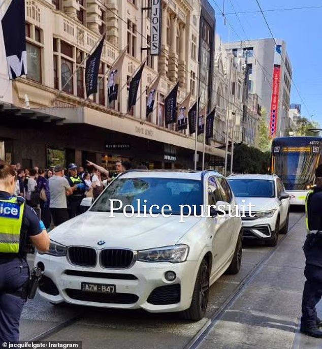 SUV – dengan jendela yang hancur – dikelilingi oleh polisi sekitar pukul 13:30 pada hari Senin ketika penghuninya dilaporkan melarikan diri melalui department store Myer di dekatnya.