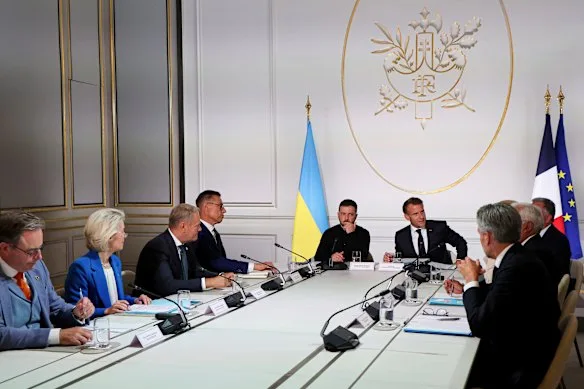 Dari kiri, Perdana Menteri Belgia Bart de Wever, Presiden Komisi Eropa Ursula von der Leyen, PM Polandia Donald Tusk, Presiden Finlandia Alexander Stubb, Volodymyr Zelensky dari Ukraina, dan Emmanuel Macron dari Prancis menghadiri KTT Paris secara langsung.