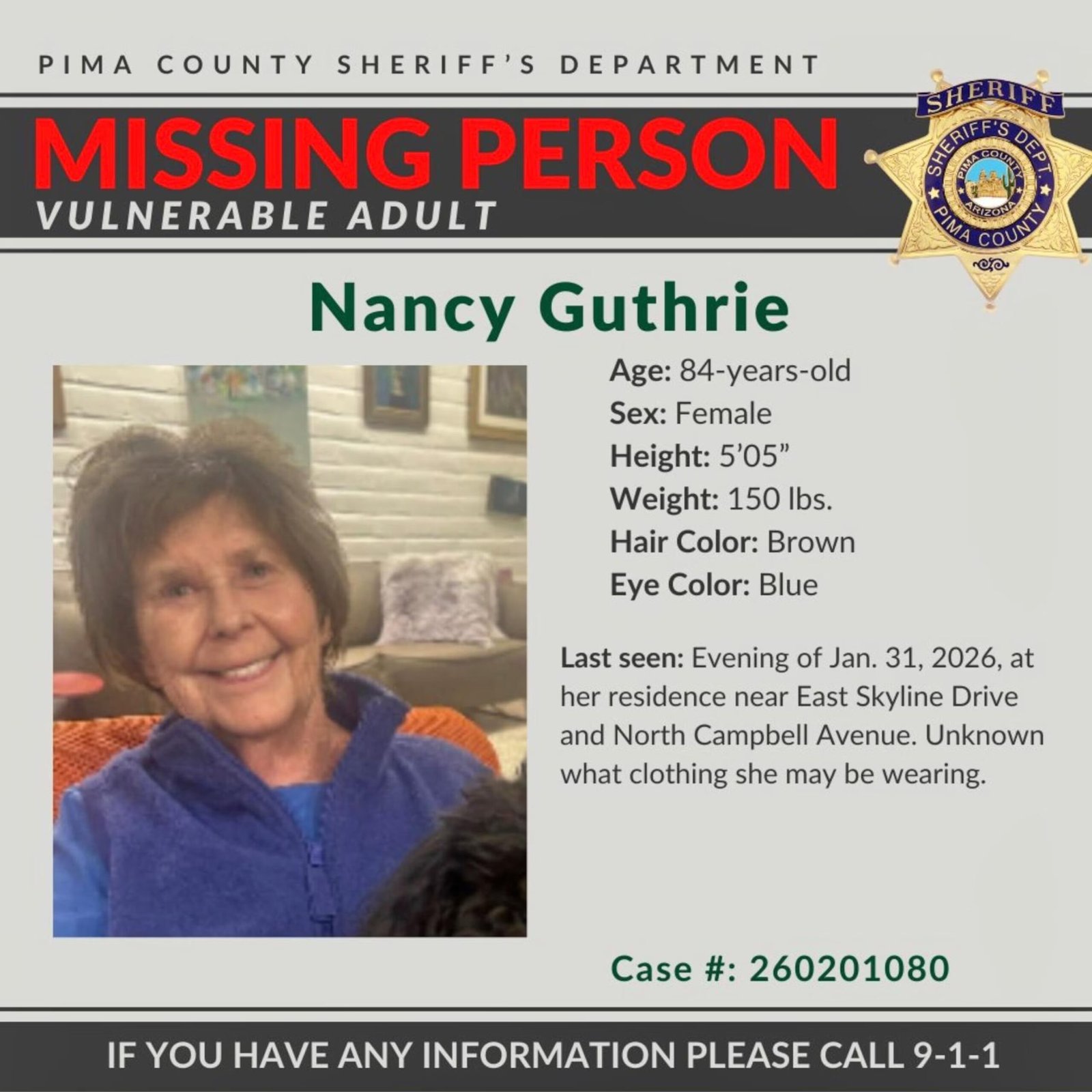 Nancy Guthrie, 84, terakhir terlihat di rumahnya di daerah Catalina Foothills, utara Tucson, pada Sabtu malam, menurut Departemen Sheriff Pima Area. Keluarganya melaporkan dia hilang pada hari Minggu sekitar tengah hari waktu setempat setelah dia tidak datang ke gereja, kata pihak berwenang.