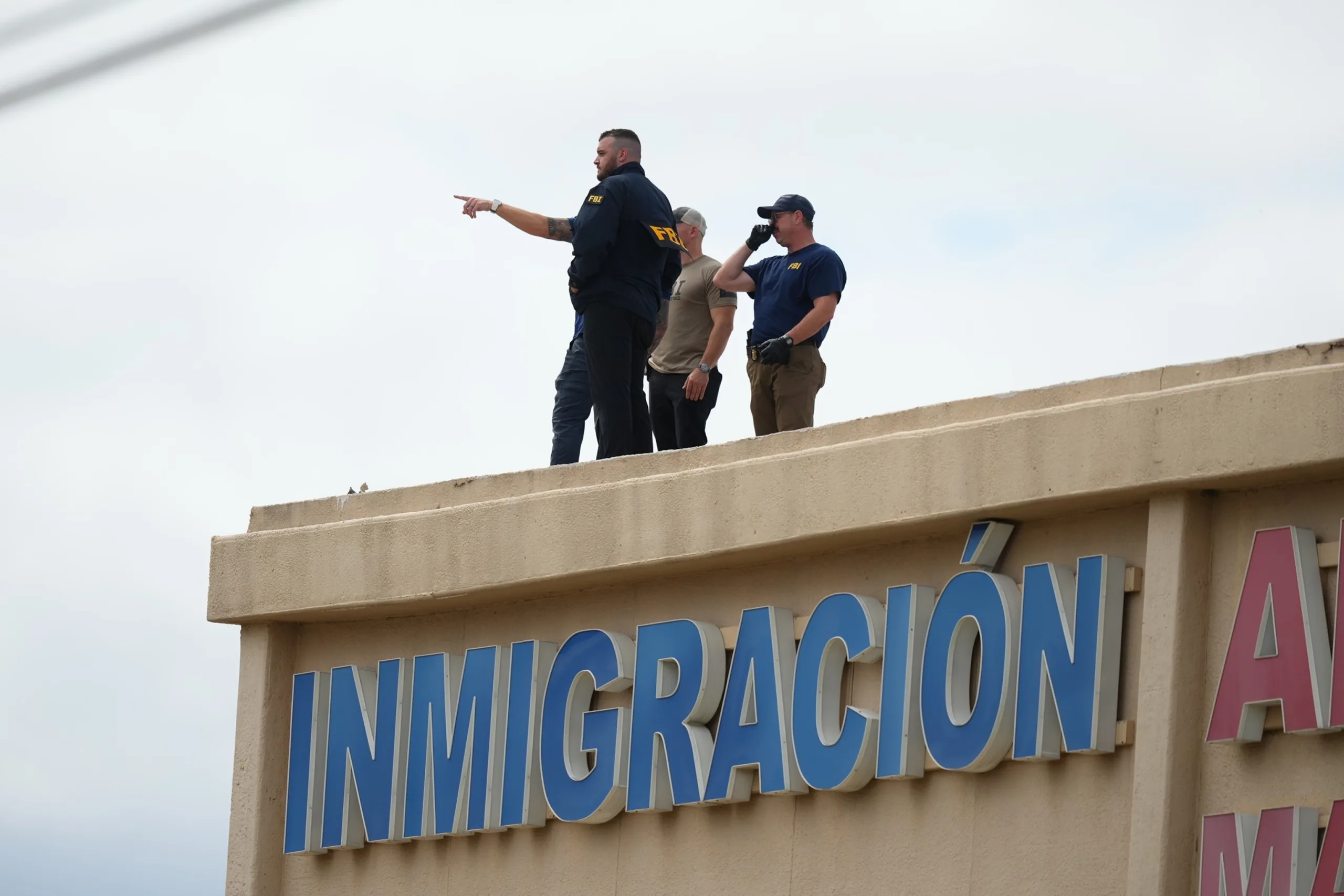 Agen penegak hukum melihat -lihat atap bangunan di dekat tempat penembakan di kantor penegakan Imigrasi dan Bea Cukai AS di Dallas, 24 September 2025.