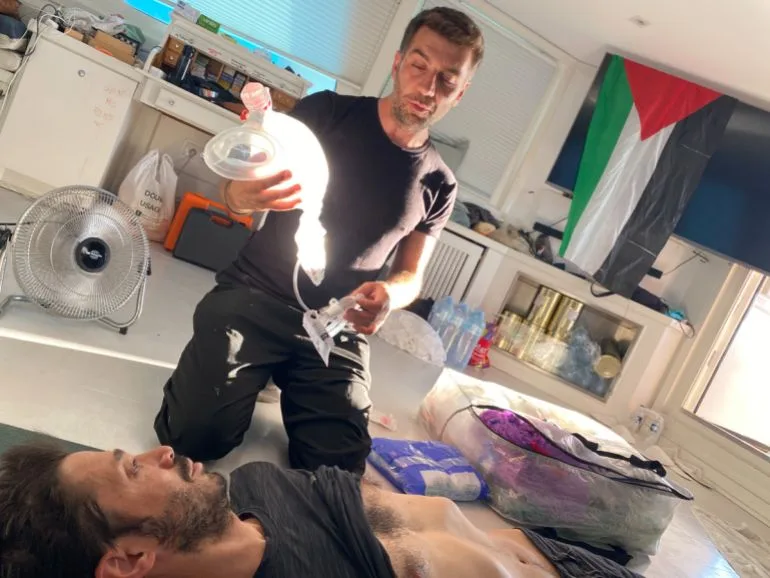 Armada mendekati “zona kuning” setelah berangkat dari Sisilia, Italia – zona di perairan internasional antara Italia dan Siprus di mana serangan Israel dimungkinkan – dan sudah waktunya untuk mempraktikkan bagaimana bertindak jika terjadi serangan.