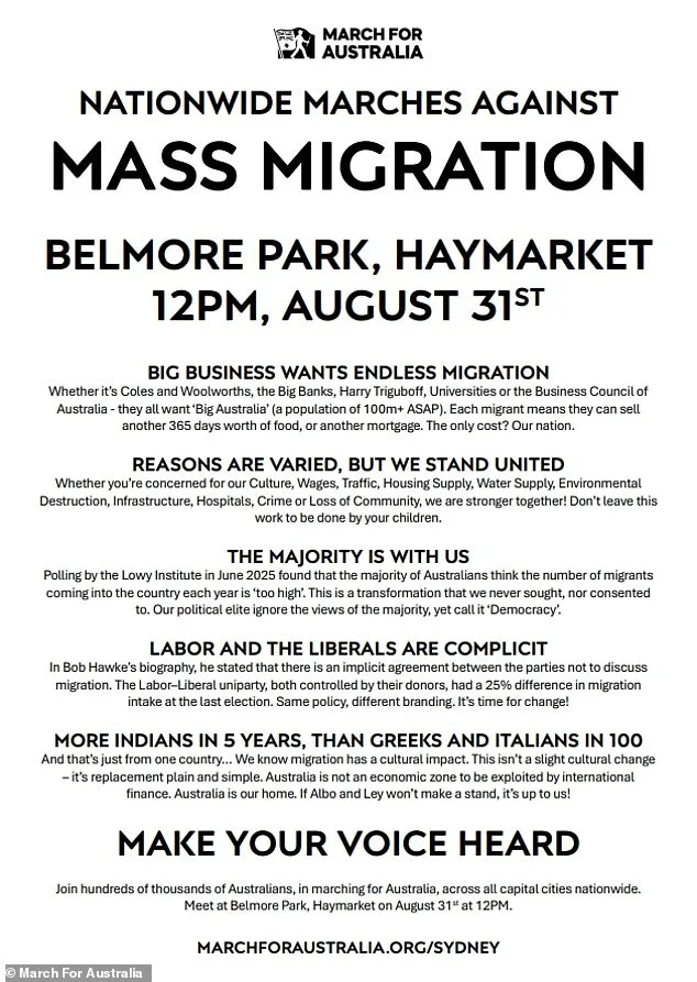 Anti -Imigration Group March untuk Australia telah merilis policy yang mengkhawatirkan sebelum protes nasional, bersumpah untuk menentang apa yang disebutnya ‘migrasi tanpa akhir’ – sebuah sistem yang diklaimnya didorong oleh bisnis besar dan didukung oleh partai -partai politik besar.