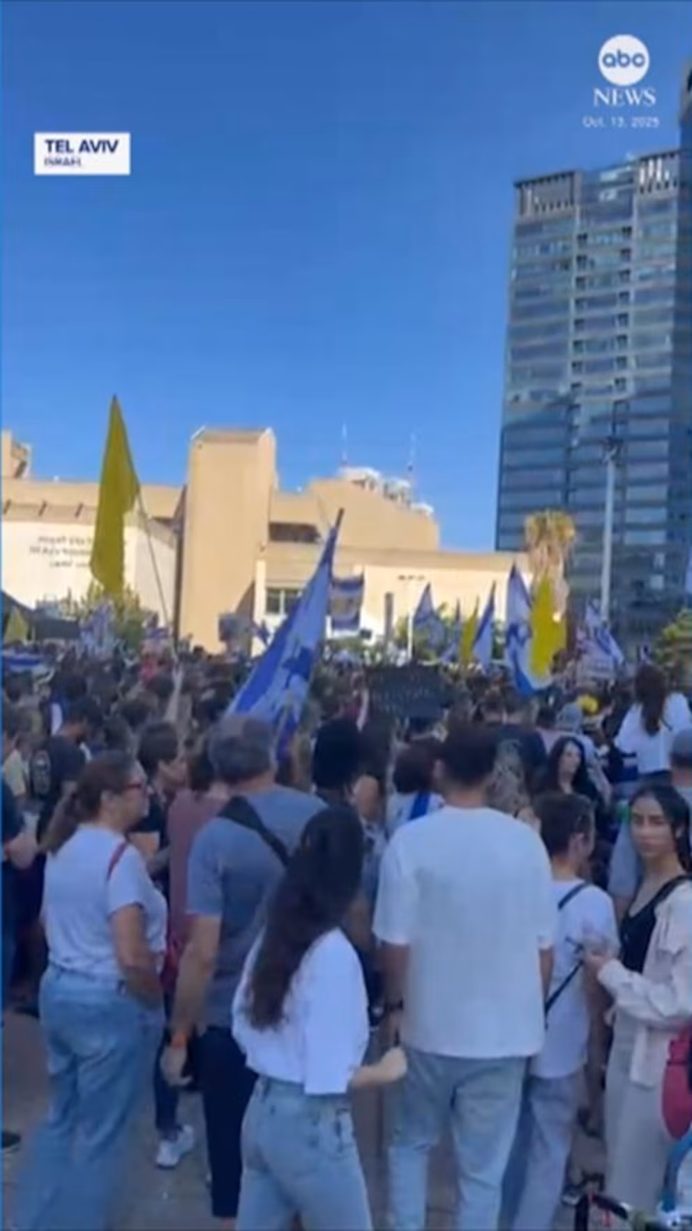 ABC News berada di Lapangan Penyanderaan di Tel Aviv, saat warga Israel berkumpul untuk merayakan pembebasan sandera yang ditahan di Gaza.