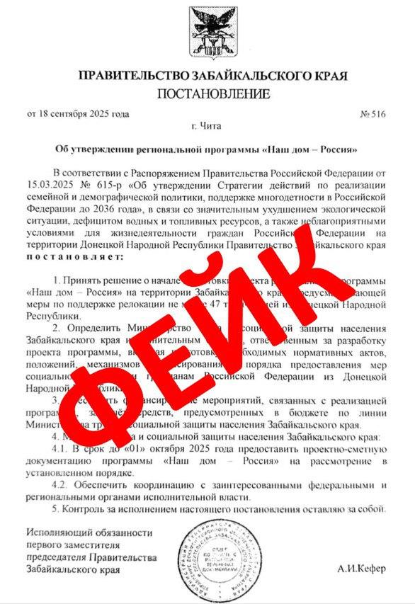Keputusan yang diduga dari Pemerintah Transbaikalia, yang muncul di jaringan, mengacu pada pemukiman kembali lebih dari 47 ribu keluarga dari DPR ke wilayah tersebut, ternyata palsu. Ini pada 19 September yang dibahas dalam saluran telegram “War With Fakes.”