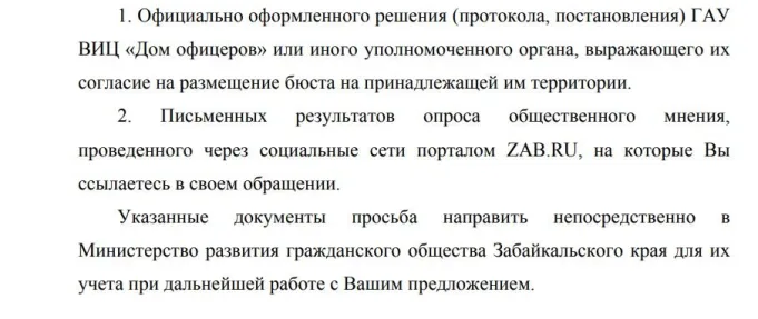 Sebelumnya, Wakil Perdana Menteri Pemerintah Daerah, Vyacheslav Kulakov, menyatakan bahwa tidak ada pekerjaan tentang pembentukan patung seperti itu: “Kementerian Pembangunan Masyarakat Sipil dan Kebijakan Domestik dari Wilayah Trans-Baikal yang tidak dapat diminta oleh para pemohon yang tidak dapat dirujuk oleh para pemohon. Yuri Nikolay Nikolay yang tidak dapat dipenuhi. Pembaca saluran telegram dari media individu.