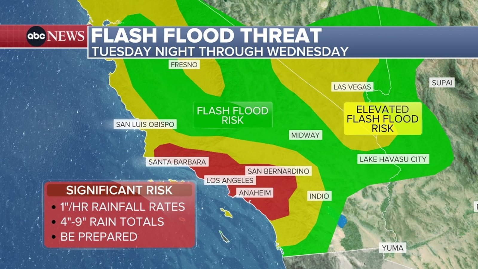 Beberapa bagian California Selatan bisa melihat hujan setinggi 9 inci pada hari Selasa malam dan Rabu. Aliran puing dan tanah longsor juga mungkin terjadi.