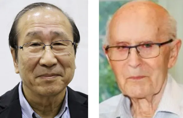 Susumu Kitagawa dari Universitas Kyoto, Jepang, kiri, dan Richard Robson dari Universitas Melbourne adalah salah satu pemenang Hadiah Nobel Kimia bersama dengan profesor UC Berkeley Omar Yaghi, pada Rabu, 8 Oktober 2025. (Kyodo News via AP)