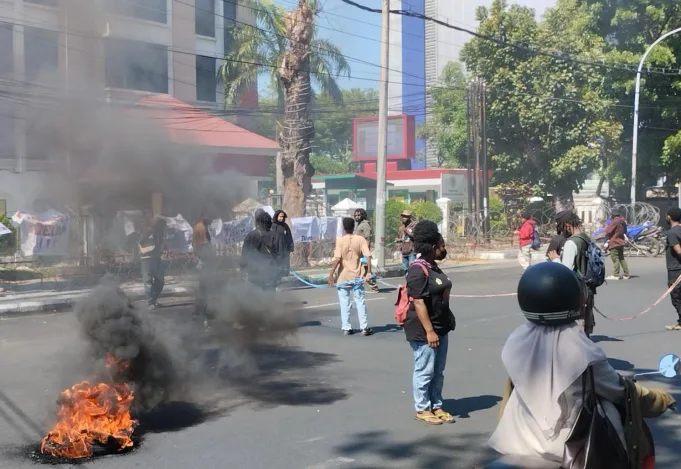 Dalam aksinya, massa membakar restriction bekas dan memasang barikade dengan tali rapiah.