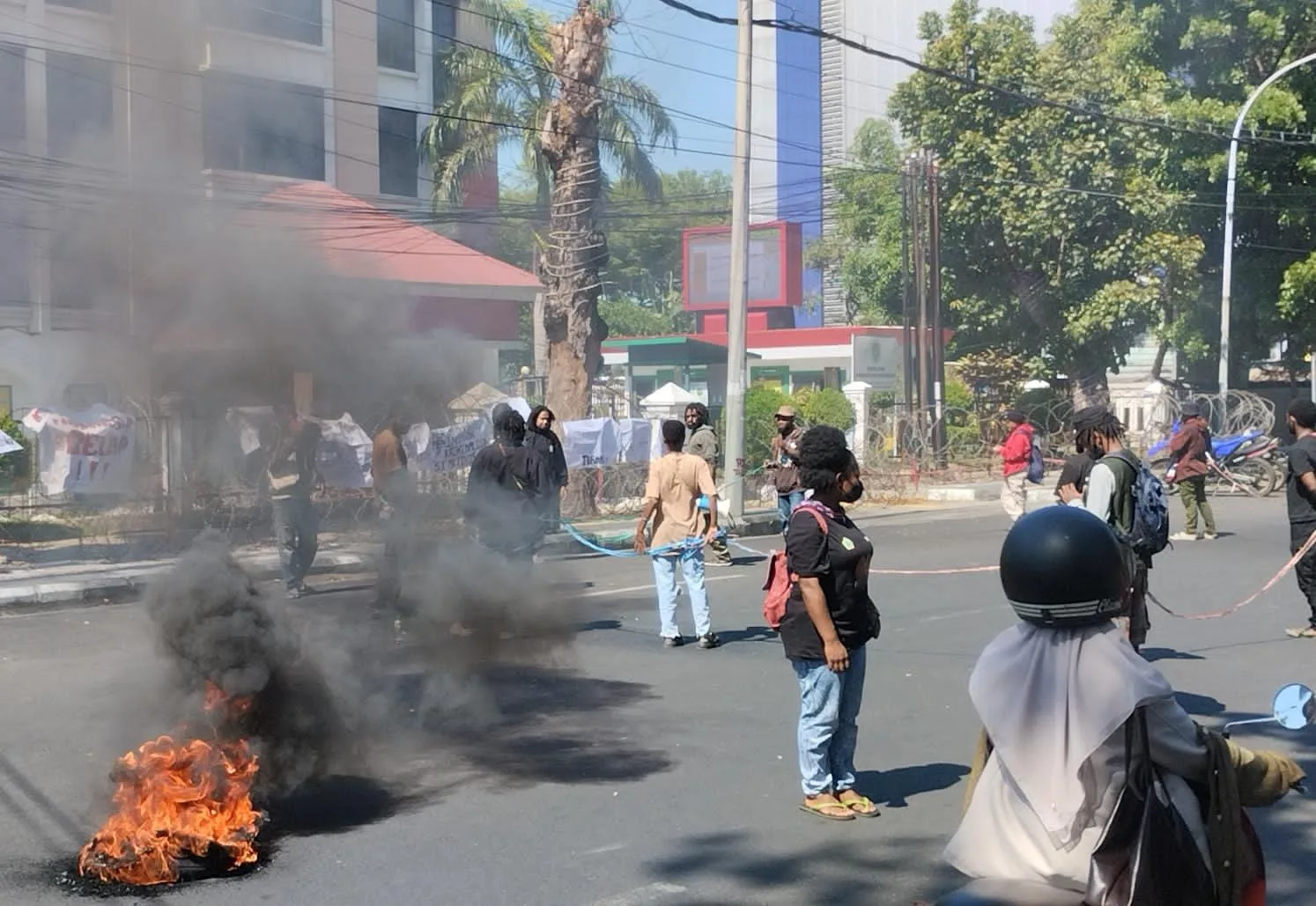 FAJAR.CO.ID, MAKASSAR– Gelombang aksi dari mahasiswa Papua kembali terjadi di depan Pengadilan Negeri (PN) Makassar, Selasa (23/ 9/2025