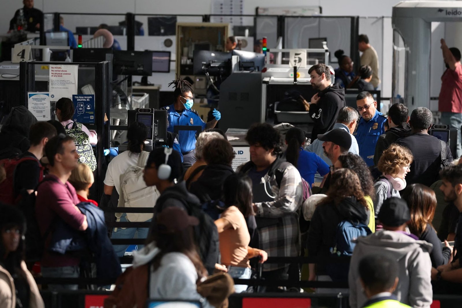Penumpang mengantri di pos pemeriksaan keamanan Administrasi Keamanan Transportasi (TSA) saat melakukan perjalanan di Bandara Internasional Los Angeles (LAX) di Los Angeles, pada 26 November 2025