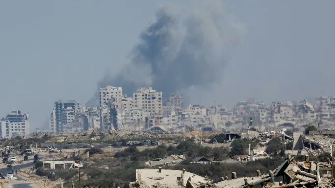 Ibrahim al-Khalili dari Al Jazeera memfilmkan saat pemogokan Israel menargetkan sebuah bangunan di belakangnya di daerah perumahan yang sibuk di Gaza City. Itu adalah salah satu dari beberapa serangan di seluruh strip yang menewaskan lebih dari 40 orang pada hari Minggu.
