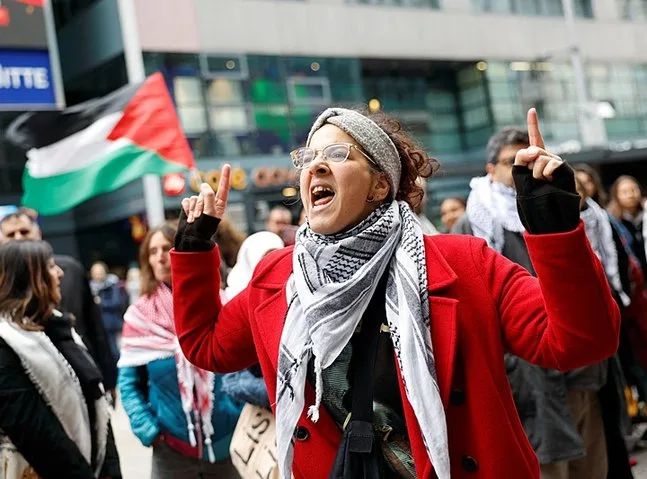 Beberapa pengunjuk rasa juga membawa poster bertuliskan: “Dari sungai hingga laut, Palestina akan merdeka.”