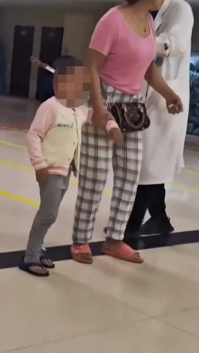 Gadis itu terlihat terhuyung -huyung ketika ibunya dipandu ke rumah sakit oleh anggota staf dengan mantel putih.
