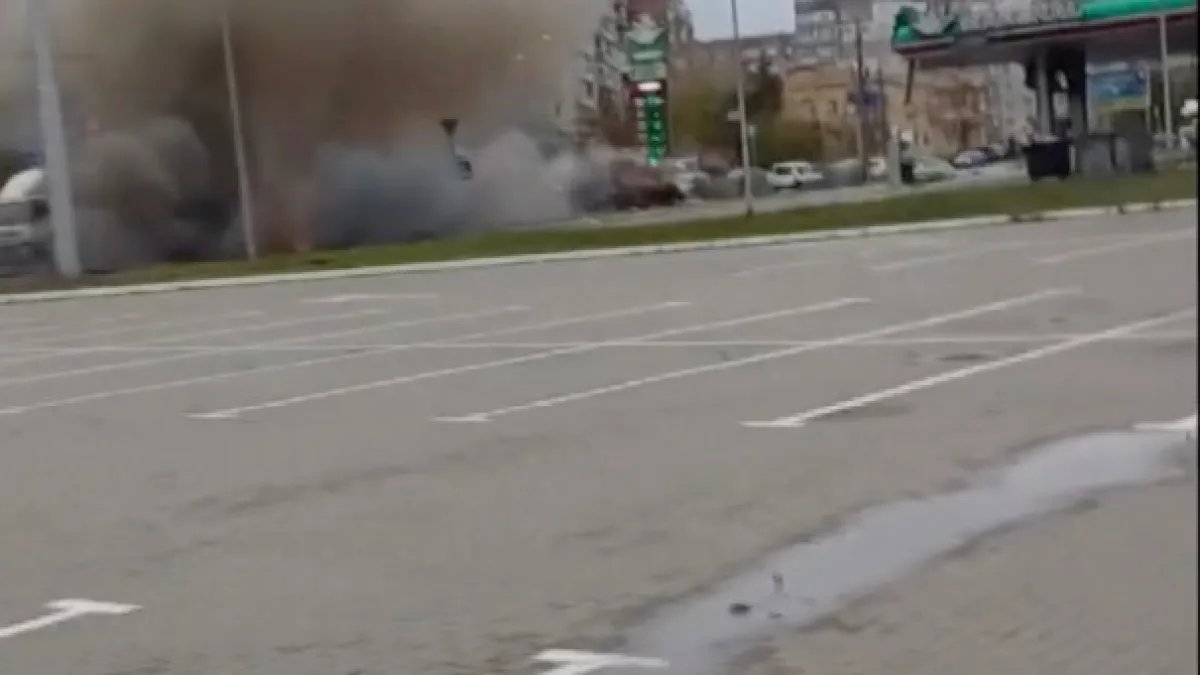 Seorang pengamat merekam saat pesawat tak berawak Rusia menyerang di dekat sebuah gedung apartemen di Sumy, Ukraina, melukai beberapa orang. Rusia melancarkan gelombang serangan drone dan rudal yang mematikan ke kota-kota di seluruh Ukraina pada hari Selasa.