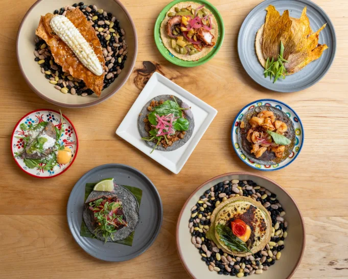 Tacomakase perdana akan menyambut tamu dengan a Quesadilla jagung biru (Dengan Kulit Babi, Oaxacan dan Cotija Cheeses dan Crema Agria dengan bawang acar), diikuti oleh enam taco inovatif: