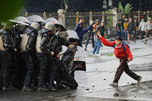 Seorang pengunjuk rasa di Jakarta melemparkan batu ke arah polisi saat melakukan protes pekan lalu terhadap tunjangan besar yang diberikan kepada anggota parlemen.Kredit: AP