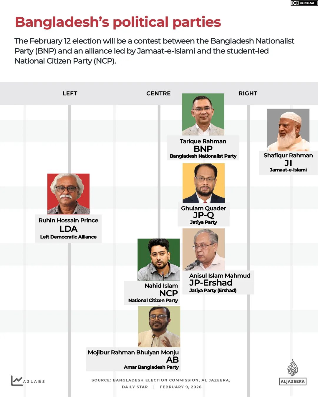 Harapan masyarakat tertuju pada dua aliansi yang terlibat dalam pemilu hari Kamis– Partai Nasionalis Bangladesh (BNP), yang dipimpin oleh Tarique Rahman, dan koalisi 11 partai yang dipimpin Jamaat-e-Islami, termasuk Partai Warga Negara Nasional (NCP), yang didirikan oleh aktivis pemuda yang menggulingkan Hasina.