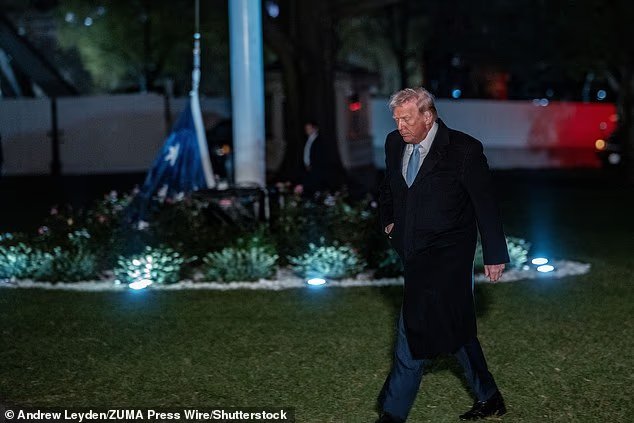 Trump digambarkan berjalan di depan spanduk yang diturunkan saat ia kembali dari Mar-a-Lago.