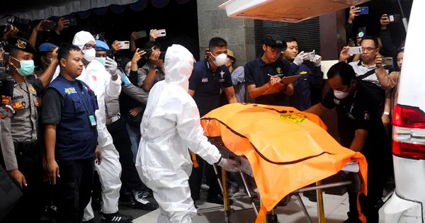 (251003) — SURABAYA, 3 Oktober 2025 (Xinhua) — Petugas kesehatan memindahkan jenazah korban runtuhnya gedung sekolah di Rumah Sakit Bhayangkara di Surabaya, Jawa Timur, Indonesia, 3 Oktober 2025. Korban tewas akibat runtuhnya gedung sekolah di provinsi Jawa Timur, Indonesia, telah meningkat menjadi delapan, kata seorang pejabat penyelamat senior, Jumat.