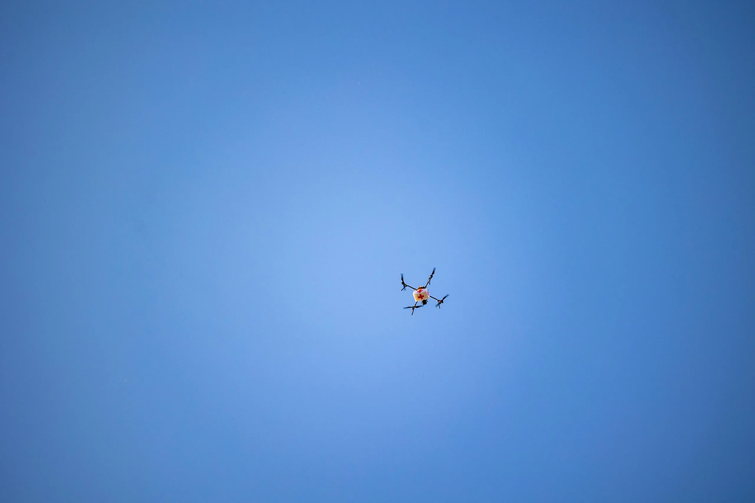 Jelaskan drone: itu menggantung di udara atau lalat, sungguh siluet yang dimilikinya, cahaya yang berkedip;