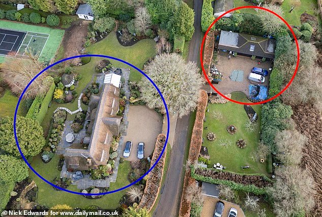 Lord Philip Harris, taipan lantai yang dikenal sebagai ‘raja karpet’, terus maju dengan garasi luas (kanan) beberapa meter dari rumahnya (kiri) di Holmbury St Mary, Surrey – meskipun rencana awalnya ditolak