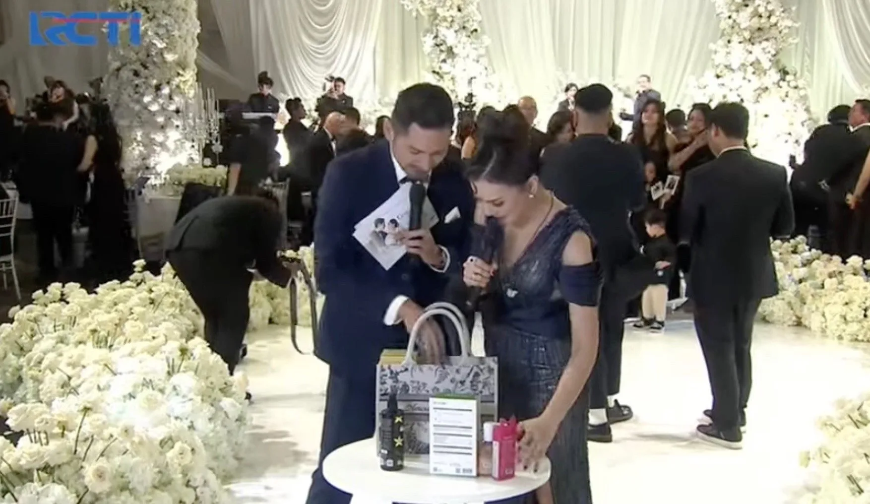 “Ada lipgloss, pembersih muka cleansing oil, suplemen (minuman), body wash, sunscreen, cushion,” ungkapnya sambil membongkar isi goodie bag pernikahan.