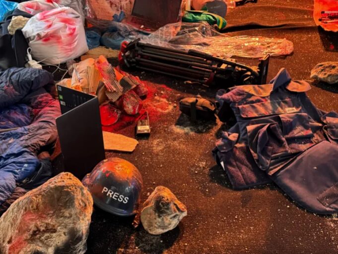 Sebuah tenda kecil yang ditopang oleh terpal tipis berdiri sendiri, dikelilingi oleh helm dan rompi biru yang berlumuran darah dan compang-camping dengan tulisan “PRESS” di atasnya. Ponsel, laptop, dan camcorder yang hancur, serta puing-puing berserakan di sekitar lokasi yang mungkin merupakan lokasi zona perang.