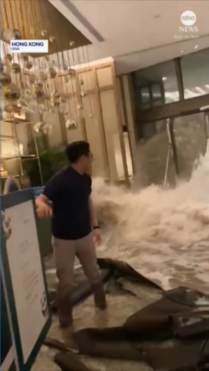 Video yang bersirkulasi online menunjukkan momen dramatis banjir banjir menghancurkan pintu sebuah hotel di Hong Kong.