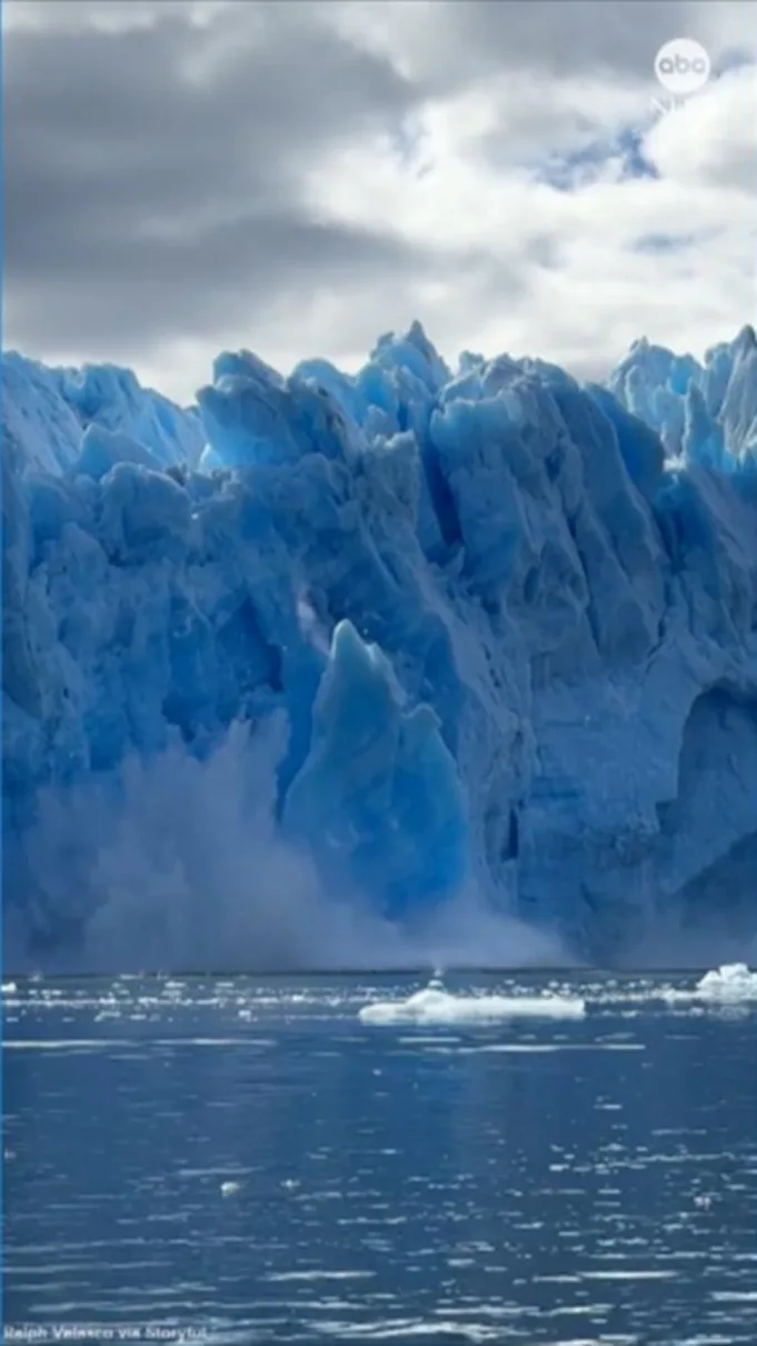 Video saksi mata menangkap sepotong besar es yang terputus dengan cara yang spektakuler dari gletser Bruggen di Chili selatan.