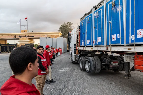 Saat hari ketiga gencatan senjata diadakan, rekaman Associated Press menunjukkan puluhan truk melintasi perbatasan Rafah di Mesir dan Jalur Gaza. Bulan Sabit Merah Mesir mengatakan mereka membawa pasokan medis, tenda, selimut, makanan dan bahan bakar.