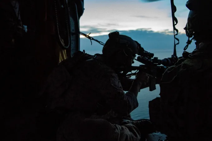 Segel Angkatan Laut melakukan pengintaian dari helikopter Sea Hawk MH-60-an.