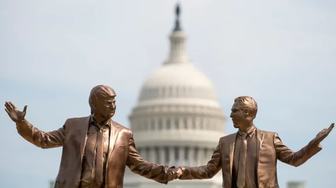 Patung -patung yang menggambarkan Presiden Trump dan pelaku pelanggar seks yang terpidana Jeffrey Epstein terlihat Selasa di National Mall di Washington, DC – acara terbaru dalam kontroversi tentang hubungan presiden dengan pemodal.