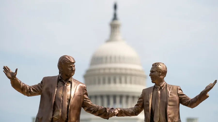 Sebuah plakat antara kedua patung itu berbunyi, “Untuk Menghormati Bulan Persahabatan,” diikuti oleh, “Kami merayakan ikatan yang tahan lama antara Presiden Donald J. Trump dan ‘teman terdekatnya,’ Jeffrey Epstein.”