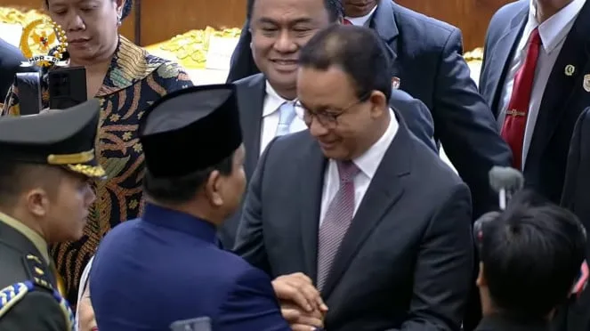 Momen Presiden RI Prabowo Subianto menggenggam erat tangan Anies usai dilantik (sumber: YouTube MPR)