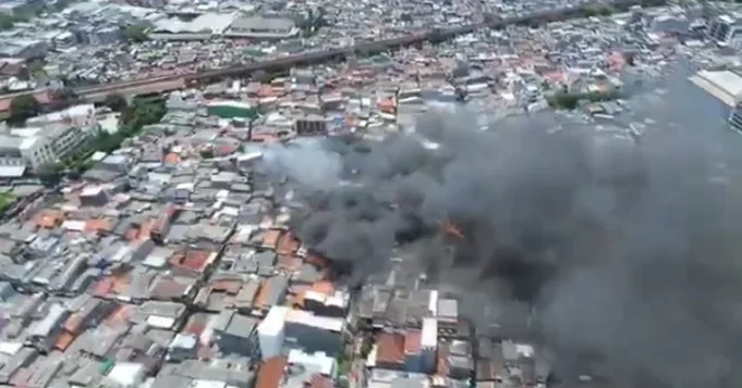 Kebakaran terjadi di permukiman padat penduduk di Gang Langgar RT 10/ RW 6, Tangki, Taman Sari, Jakarta Barat, Minggu (28/9/2025). Foto/Istimewa