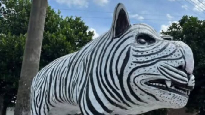 Dalam video yang diunggah akun Instagram @lambeturah tampak patung macan putih itu terpasang di persimpangan. Di kolom komentar, sejumlah warganet menilai bentuk patung tidak menyerupai harimau pada umumnya.