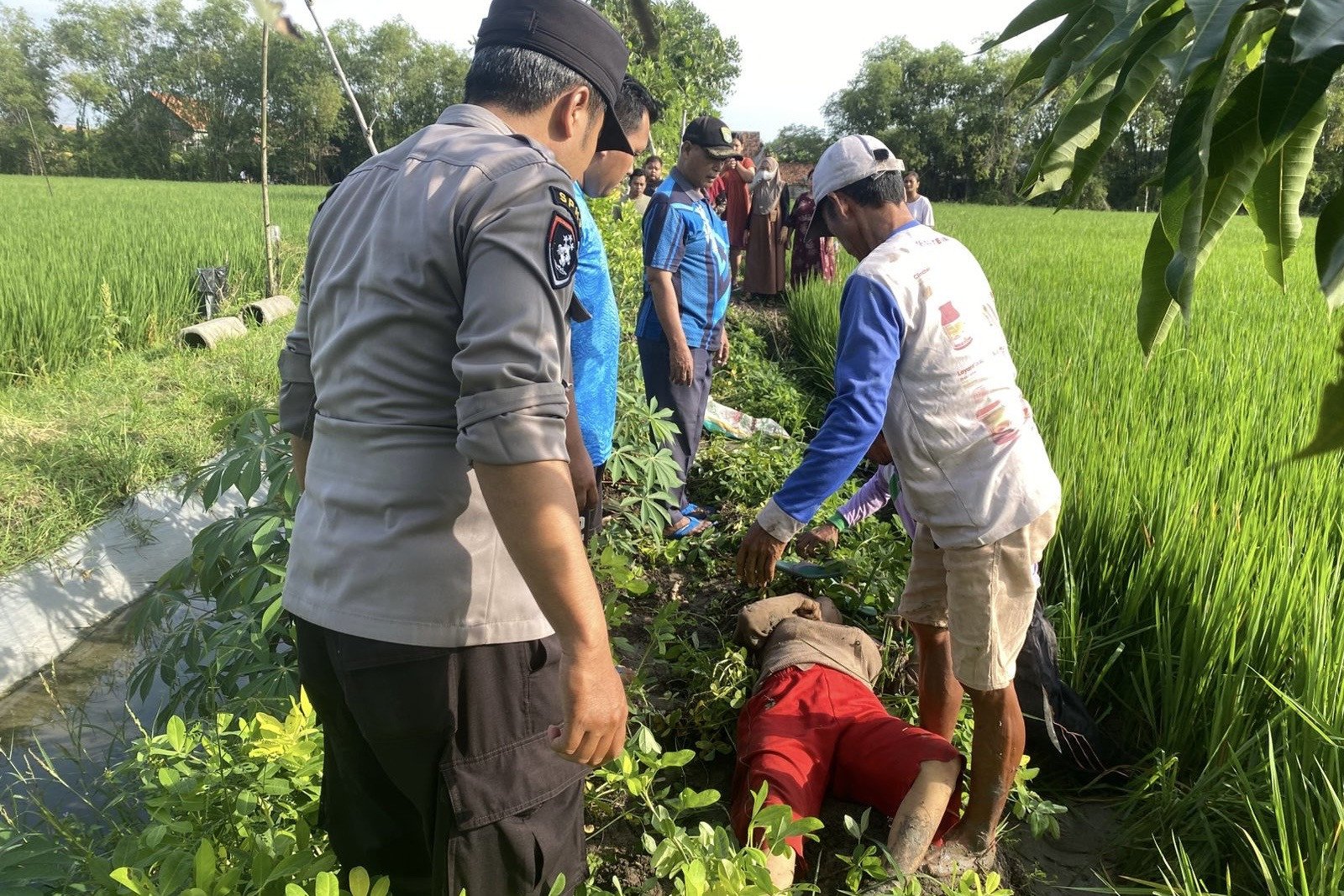 “Sesampainya di lokasi, saksi melihat sosok tubuh manusia tergeletak di pinggir sawah,” kata Hamzaid.