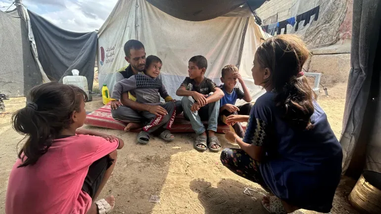 Omar duduk di kasur usang di luar tempat penampungan daruratnya, yang disumbangkan kepadanya lima bulan lalu ketika dia melarikan diri dari Khan Younis ke timur. Di sekelilingnya, empat anaknya yang lain– Anas, 12, Minas, 10, Hamoudah, 8, dan Sidra, 6– berusaha menyelesaikan perselisihan mengenai pengambilan air dari truk yang diparkir 200 meter (660 kaki) dari tenda.
