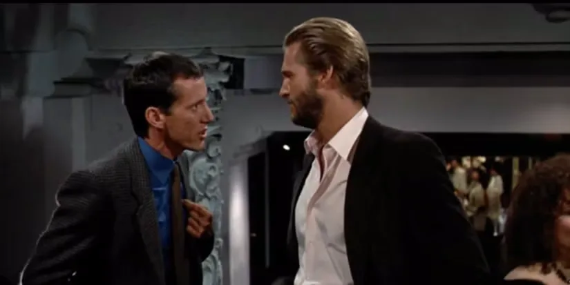 Jeff Bridges dan James Woods sebagai Terry dan Jake berkonfrontasi di Against All Odds.