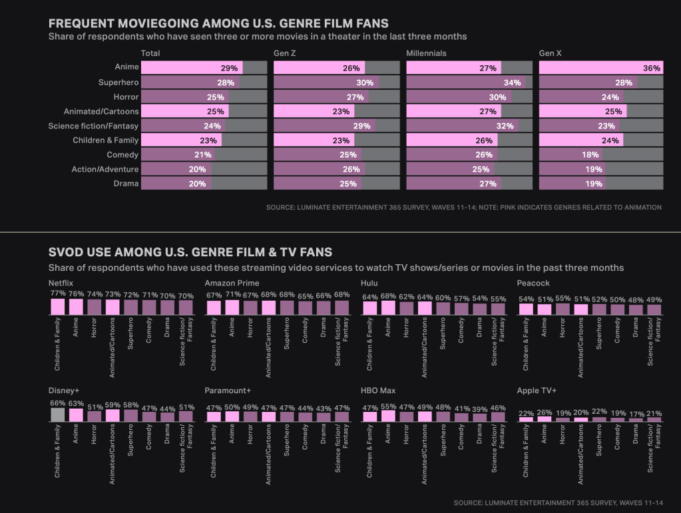 Jika dibandingkan dengan genre movie lainnya, Anime menduduki puncak semua kategori movie lainnya. Penggemar category animasi juga terbukti menjadi salah satu pengguna platform streaming terbesar. Netflix, misalnya, menyumbang 76 % pengguna yang menggunakan streamer untuk menonton konten animasi. Movie animasi dan serial television juga paling menonjol untuk Hulu dan Disney+, per luminate.