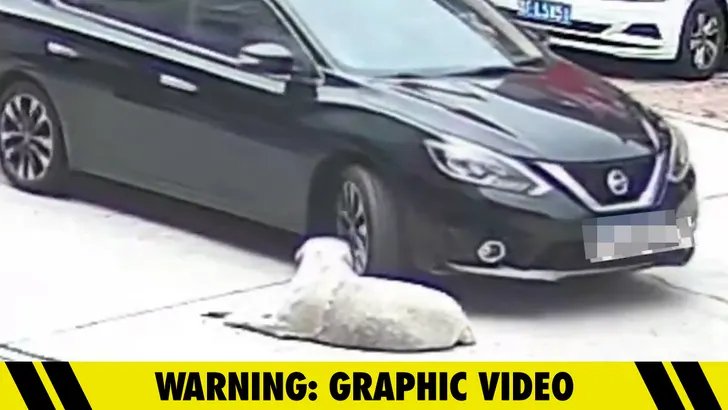 Pecinta anjing, berhati-hatilah! Kami mendapatkan video liar — anak anjing Yuanyuan seberat 140 pon sedang bersantai di tengah jalan Hangzhou, Tiongkok minggu lalu… ketika sebuah mobil melaju tepat di atasnya, membalikkan anjing itu dari perut ke dada dan membiarkannya terjepit di bawah ban.