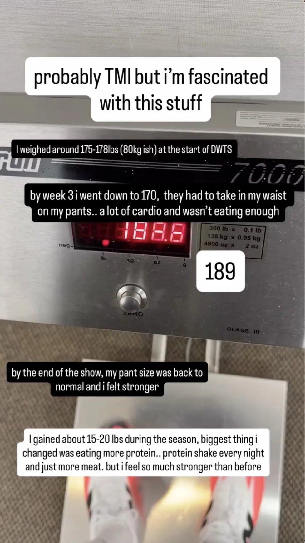 “Pada akhir pertunjukan, ukuran celana saya kembali typical dan saya merasa lebih kuat. Berat badan saya bertambah sekitar 15 – 20 pon selama musim ini, hal terbesar yang saya ubah adalah makan lebih banyak protein … protein shake setiap malam dan lebih banyak daging,” jelasnya, sambil menambahkan bahwa dia merasa “jauh lebih kuat dari sebelumnya.”