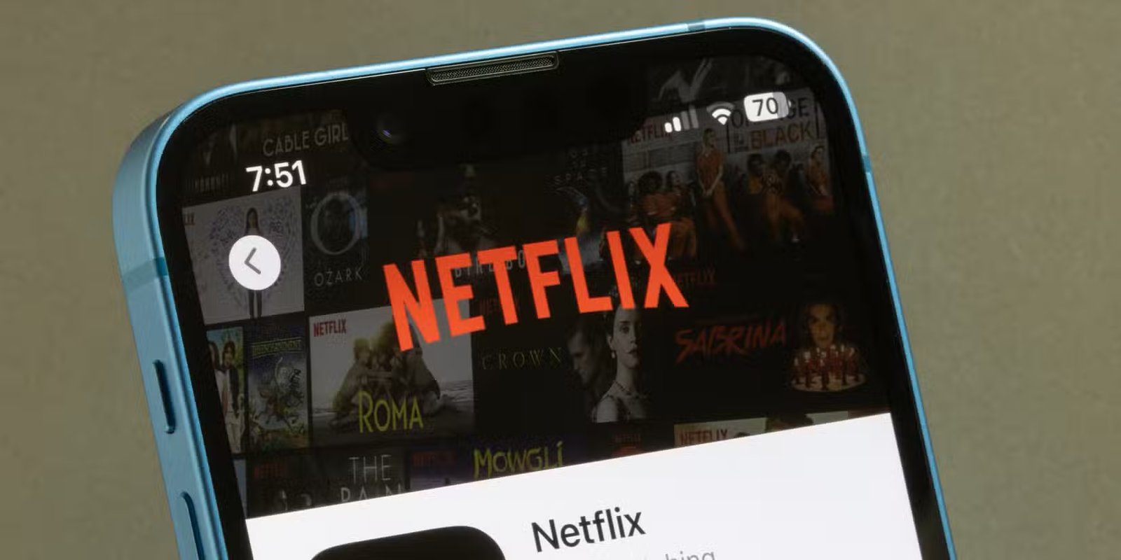 Gambar seseorang memegang ponsel berlogo Netflix.