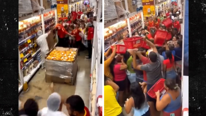 Intip kekacauannya… sebuah supermarket di Assu, Brazil, berubah menjadi supermarket gratis untuk semua orang ketika pelanggan saling dorong, berebut, dan memanjat satu sama lain untuk mengambil bungkus mie yang sangat murah — yang habis hanya dalam waktu 3 menit.