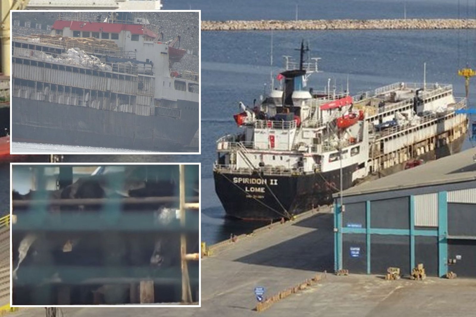 Sekitar 2.900 hewan dijejali di dalam ruang tunggu Spiridon II – kapal kargo berbendera Togo.