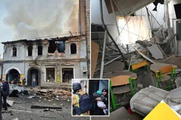 Anak-anak bergegas keluar dari kamar anak-anak di Ukraina yang diledakkan oleh drone Rusia