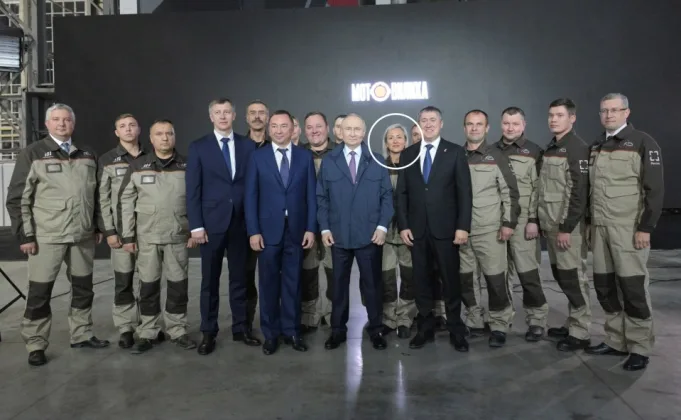 Seorang wanita pirang, yang dilingkari putih, berdiri di antara pekerja pabrik dan pejabat, termasuk Vladimir Putin, di pabrik pertahanan Motovilikha.