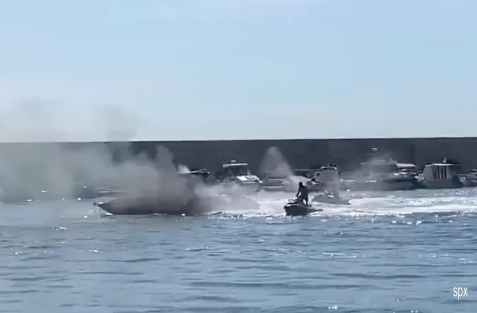 Rekaman video menunjukkan asap mengepul dari perahu motor saat berusaha meninggalkan marina setempat.
